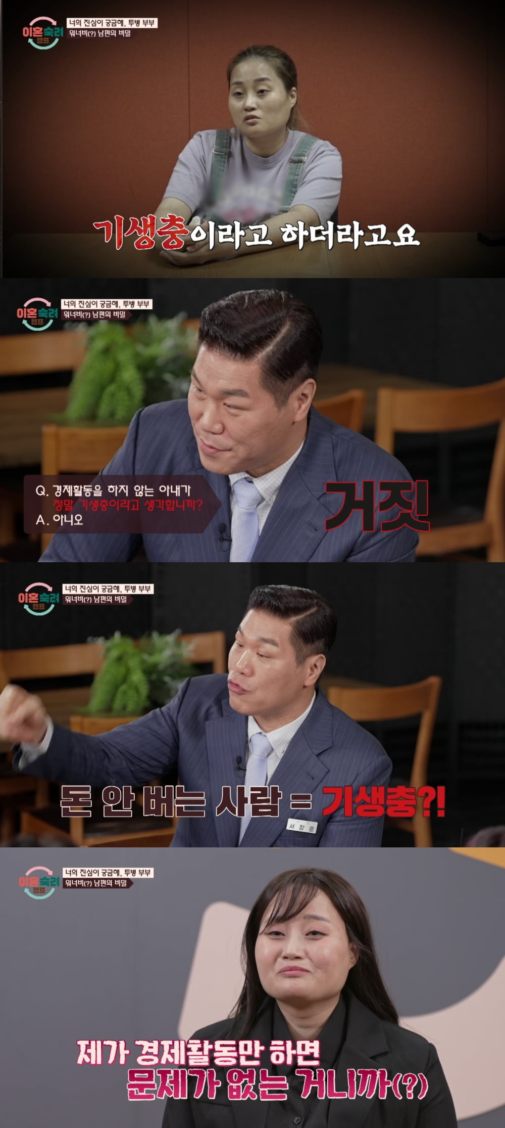 이날 방송에서 '투병 부부' 아내는 남편에게 '당신은 경제활동을 하지 않는 아내가 정말 기생충이라고 생각하냐'라고 질문했다. 남편의 대답은 '아니오'였다. 남편은 "홧김에 한 말이다. 하늘에 맹세코 그런 생각 한 적이 없다"고 해명했다.