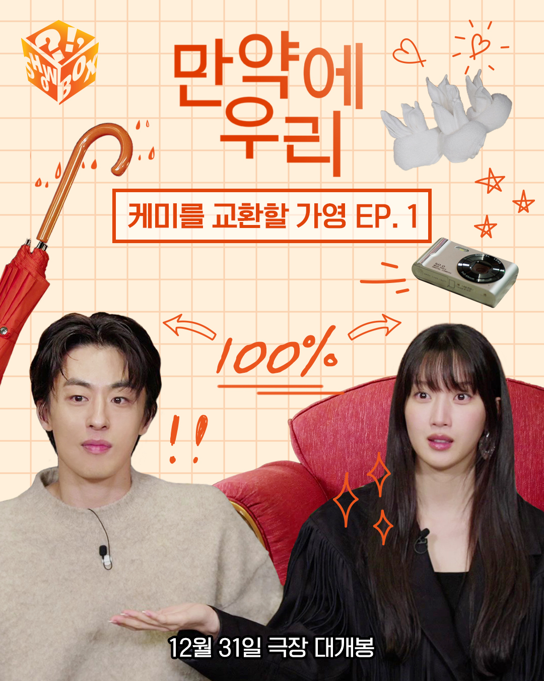 영화 <만약에 우리>는 뜨겁게 사랑했던 은호와 정원이 10년 만에 우연히 재회하며 기억의 흔적을 펼쳐보는 현실공감연애. 저녁 6시 쇼박스 유튜브를 통해 공개되는 예능 [케미를 교환할 가영]에서는 구교환과 문가영, 두 배우가 영화를 소개하며 콘텐츠를 시작한다. 이들은 작품 속 감정과 관계를 상징하는 영화의 주요 키워드를 자유롭게 선택한 뒤, 해당 키워드와 연관된 미니 게임에 도전한다. 게임에 성공할 경우 구독자들에게 증정할 수 있는 영화 예매권을 획득할 수 있어 더욱 몰입도를 높인다. 이번 자체 예능은 작품에 대한 진솔한 이야기와 게임을 통해 두 배우의 케미스트리를 자연스럽게 전하며 영화에 대한 기대감을 끌어올릴 예정이다.