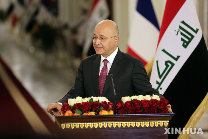 [ 유엔본부=신화/뉴시스] 유엔총회에서 12월 18일 유엔난민기구(UNHCR) 최고대표로 선출된 살리 전 이라크 대통령이 바그다드에서 2020년 연설하는 모습. 그는 이번 유엔총회에서 필리포 그란디 이탈리아출신 대표의 후임으로 선출되어 내년 1월 1일 취임한다. 2025. 12.19. |