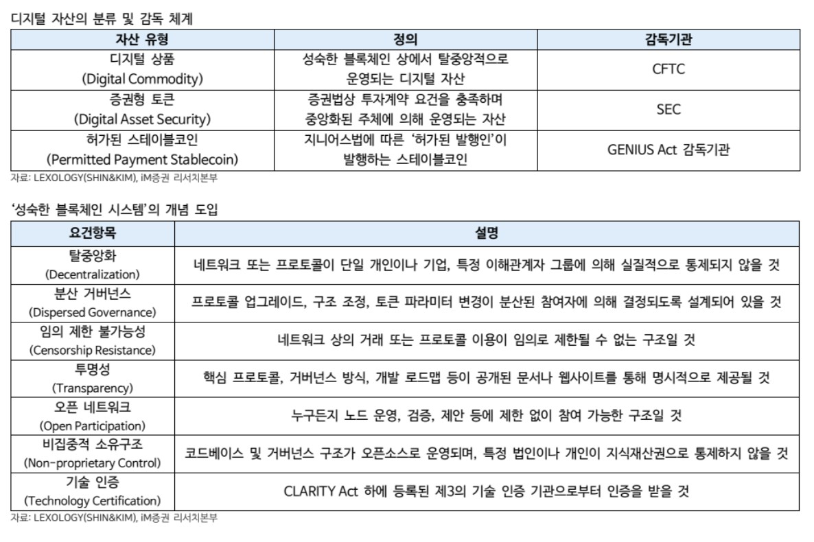 양 연구원은 “법안상 디지털자산이 탈중앙화, 분산 거버넌스, 투명성, 오픈 네트워크, 비집중적 소유 구조 등 이른바 ‘성숙한 블록체인 시스템’ 요건을 충족하면 ‘상품’으로 분류돼 CFTC 관할을 받는다”며 “요건을 충족하지 못하면 ‘증권’으로 규정돼 SEC의 엄격한 규제가 적용된다”고 말했다.