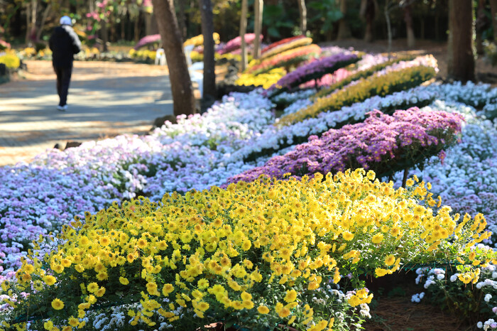 18일 오전 제주시 한림읍 한림공원을 찾은 시민이 ‘겨울 국화’가 활짝 핀 산야초원을 둘러보고 있다. 연합뉴스 |