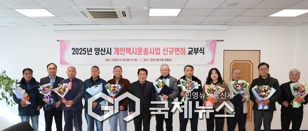 (양산=국제뉴스) 박영헌 기자 = 양산시는 지난 18일 「2025년도 개인택시 신규면허」 교부식을 가졌다. 이번 교부식은 개인택시 신규면허자들에게 면허증을 교부하고, 안전하고 친절한 교통서비스 제공을 당부하기 위해 마련됐다.