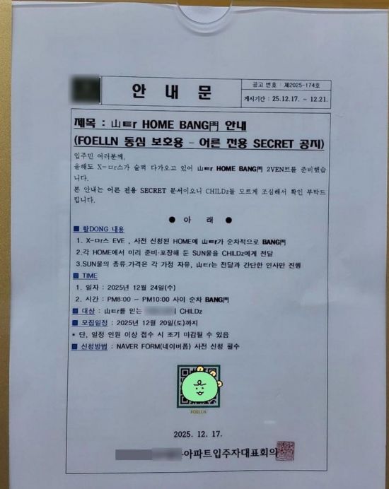 안내문에는 '어른 전용 SECRET 공지. 올해도 X-ㅁr스가 슬쩍 다가오고 있어 山ㅌr HOME BANG門 2VEN트를 준비했다'고 적혀 있었다. 해석해보면 어른 전용 비밀 공지이며, 크리스마스를 맞아 산타 집 방문 이벤트를 준비했다는 내용이다.