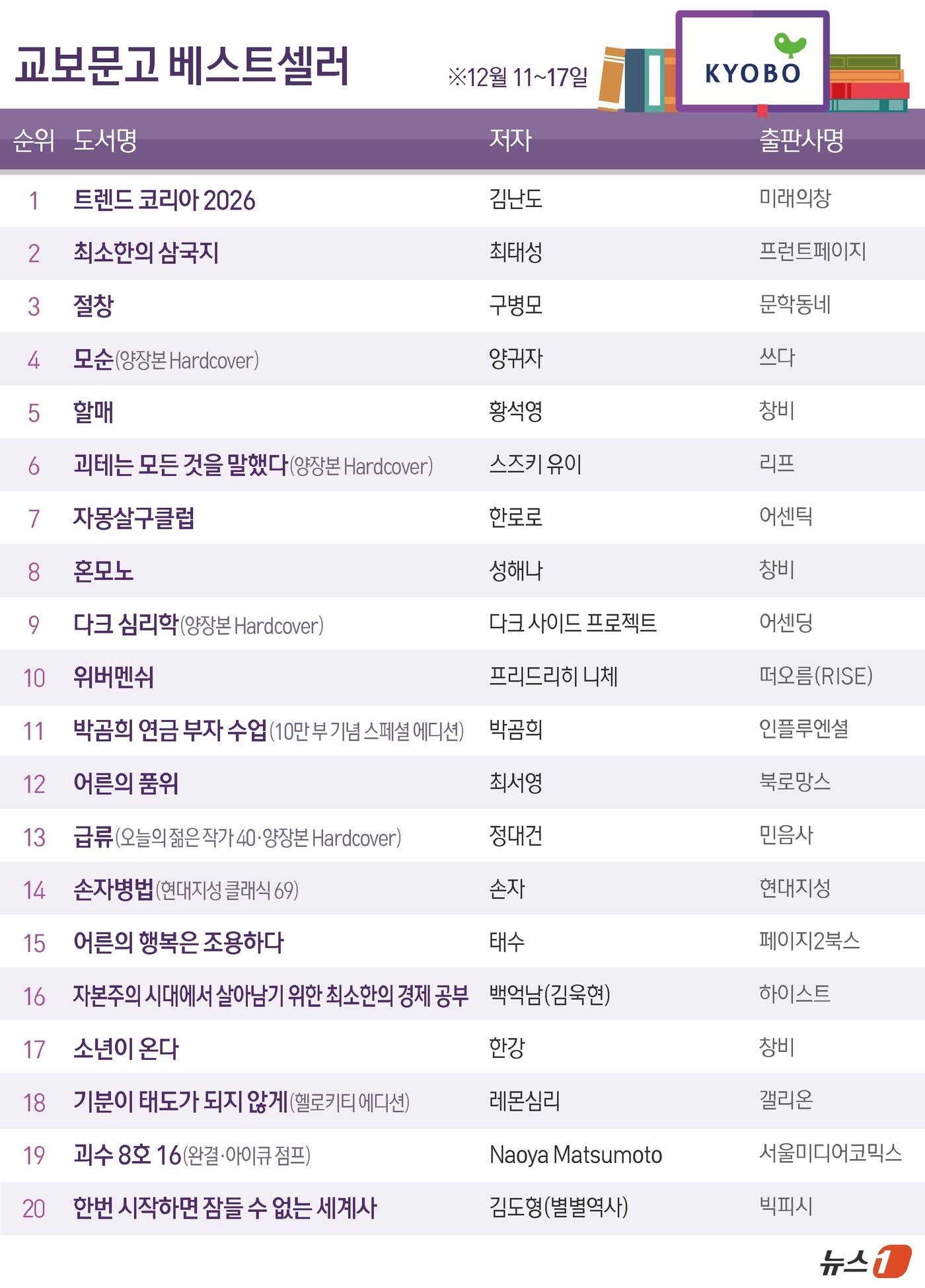 교보문고 최신 주간(12월 11일~12월 17일) 종합 베스트셀러
