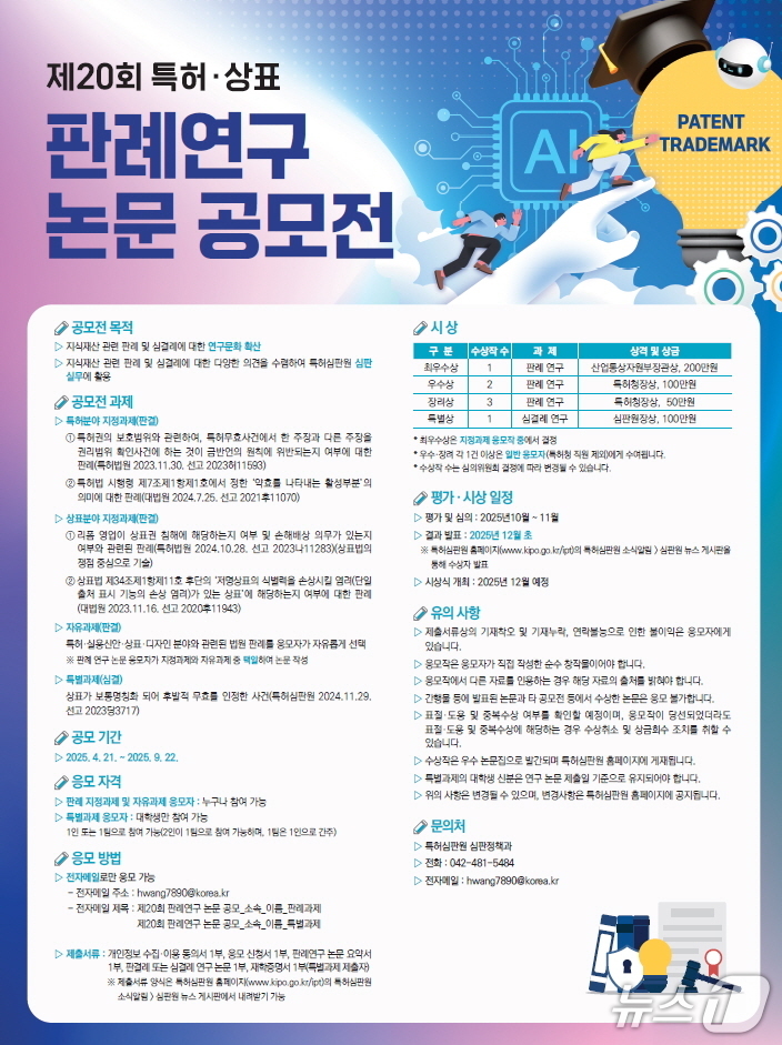 (대전=뉴스1) 박찬수 기자 = 지식재산처 특허심판원은 19일 오후 2시 특허심판원(대전시 서구) 국제회의실에서 2025년 판례연구논문 공모전에서 선정된 우수 판례연구논문 6건에 대한 시상식을 개최한다.
