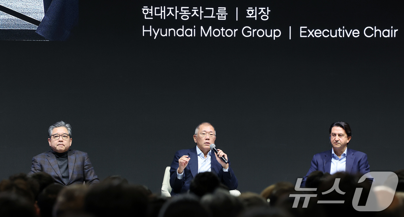 정의선 현대자동차그룹 회장이 지난 1월 경기 고양시 현대 모터스튜디오 고양에서 열린 2025 신년회에서 경영진들과 좌담회를 갖고 있는 모습(자료사진). 왼쪽부터 장재훈 현대차그룹 부회장, 정 회장, 호세 무뇨스 현대차 대표이사 사장. 2025.1.6/뉴스1 ⓒ News1 이동해 기자 |