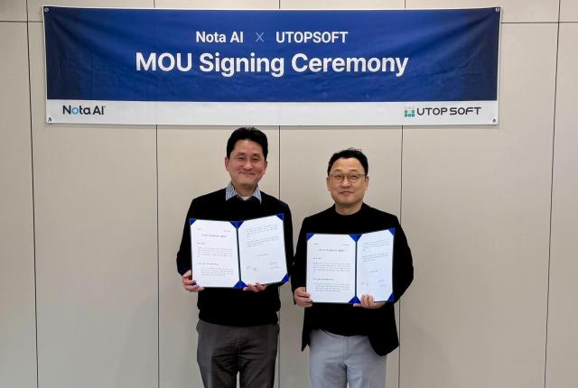 노타 양석열 이사(왼쪽)와 유탑소프트 김성범 대표이사(오른쪽)가 삼성동 노타 오피스에서 열린 양해각서(MOU) 체결식에서 기념촬영을 하고 있다.[사진=노타] |