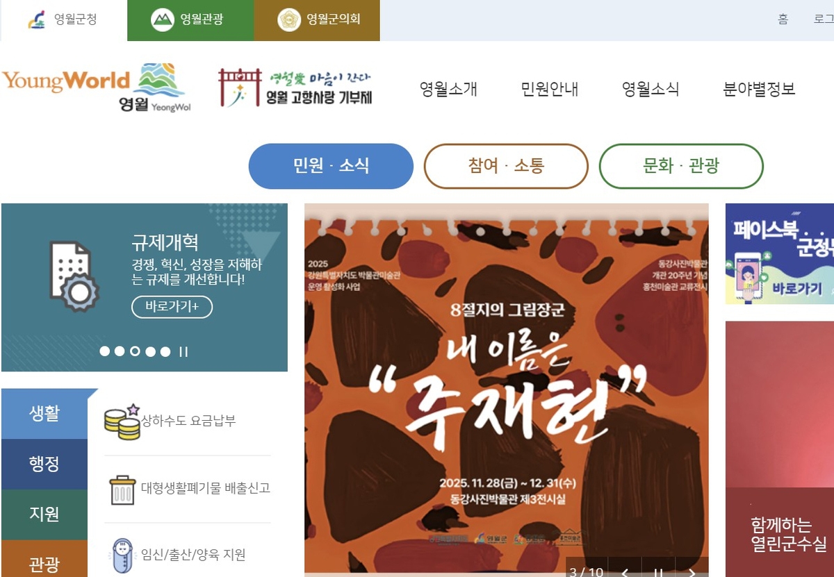 영월군 인터넷 홈페이지 초기 화면 갈무리. |