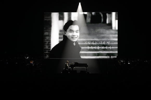 김동률이 전람회 멤버였던 故 서동욱을 추모하며 무대를 선보이고 있다. [사진=뮤직팜] |
