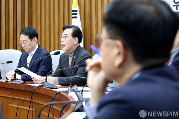 [서울=뉴스핌] 최지환 기자 = 송언석 국민의힘 원내대표가 19일 오전 서울 여의도 국회에서 열린 원내대책회의에서 발언하고 있다. 2025.12.19 choipix16@newspim.com