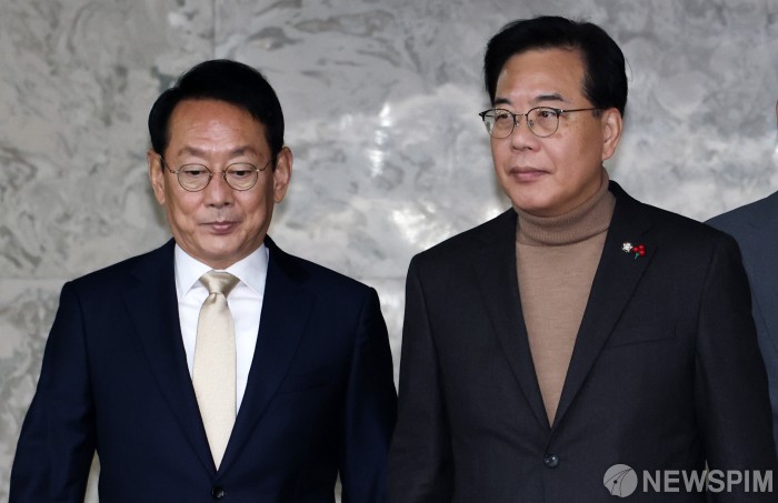 [서울=뉴스핌] 최지환 기자 = 송언석 국민의힘 원내대표(오른쪽)와 김도읍 정책위의장이 19일 오전 서울 여의도 국회에서 열린 원내대책회의에 입장하고 있다. 2025.12.19 choipix16@newspim.com