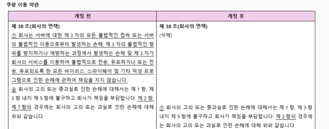 19일 쿠팡은 이달 26일부터 이용 약관 내 '해킹·불법 접속으로 인한 손해는 책임지지 않는다'는 제38조 7항의 내용을 삭제한다고 전날 공지했다.