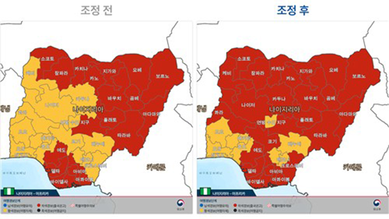 나이지리아 케비, 카두나, 코기, 콰라, 나이저, 크로스리버주는 2단계(여행자제)에서 3단계(철수권고)로 여행경보가 상향됩니다.