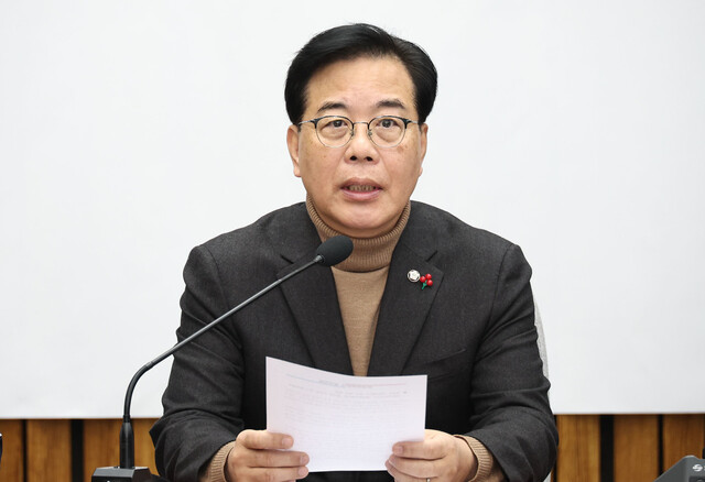 송언석 국민의힘 원내대표가 19일 국회에서 열린 원내대책회의에서 발언하고 있다. 윤운식 선임기자 yws@hani.co.kr |