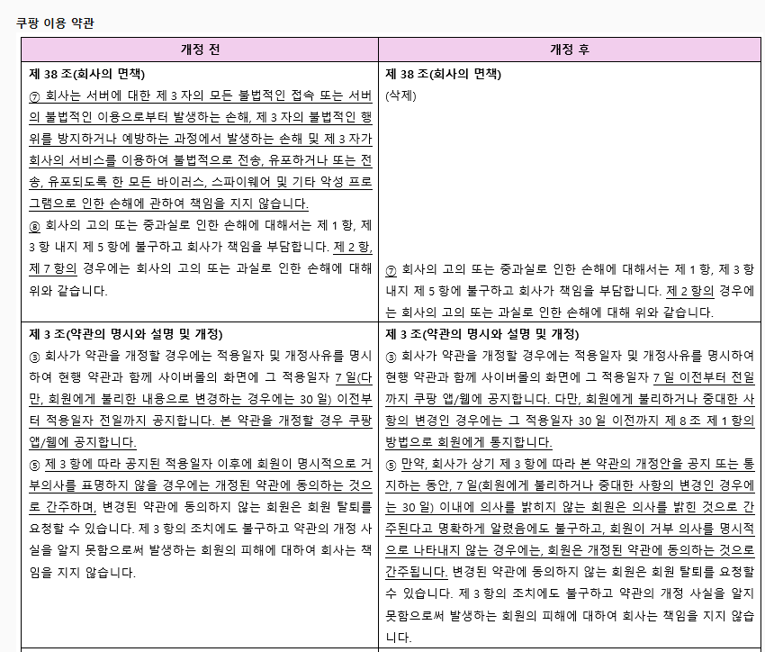 향후 약관 개정 내용이 소비자에게 불리하거나 중대한 사항일 경우, 기존처럼 적용 7일 전부터 쿠팡 앱이나 웹사이트에 공지하는 것 외에도 적용 일자 30일 이전까지 이메일, 문자메시지(SMS), 전화, 팩스 등을 통해 회원에게 개별적으로 직접 알리는 내용을 신설했다.