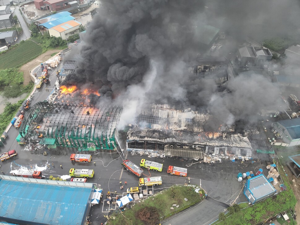 충북 소방본부가 지난해 7월 청주시 오창의 한 공장에서 난 화재 진화에 힘쓰고 있다. 충북소방본부 누리집 사진자료 |