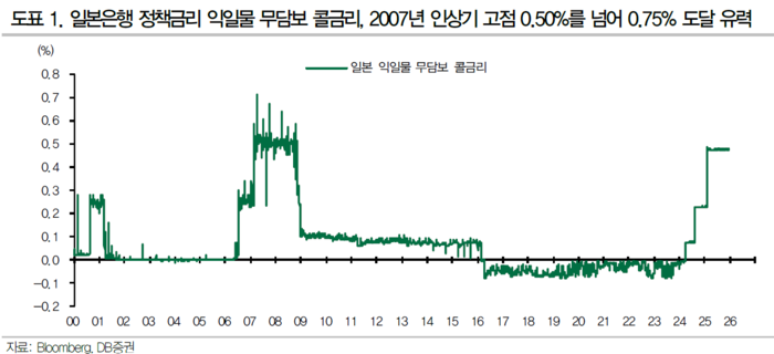 DB금융투자는 “향후 1년 시계에서 BOJ가 도달 가능한 금리 한계치는 중립금리 추정 레인지 하단인 1.00% 부근이 될 것”이라고 내다봤다.
