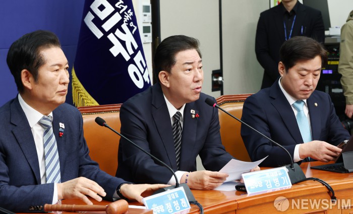 [서울=뉴스핌] 정일구 기자 = 김병기 더불어민주당 원내대표가 19일 오전 서울 여의도 국회에서 열린 최고위원회의에서 모두발언을 하고 있다. 2025.12.19 mironj19@newspim.com