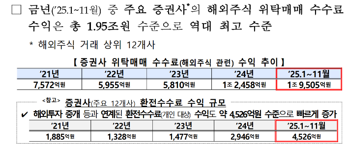 증권사 해외주식 위탁매매 수수료 수익은 지난 2021년 7572억원에서, 2022년 5955억원, 2023년 5810억원, 지난해 1조2458억원으로 늘었다. 환전수수료 수익도 올해 들어 지난 11월까지 4526억원으로 빠르게 증가했다.