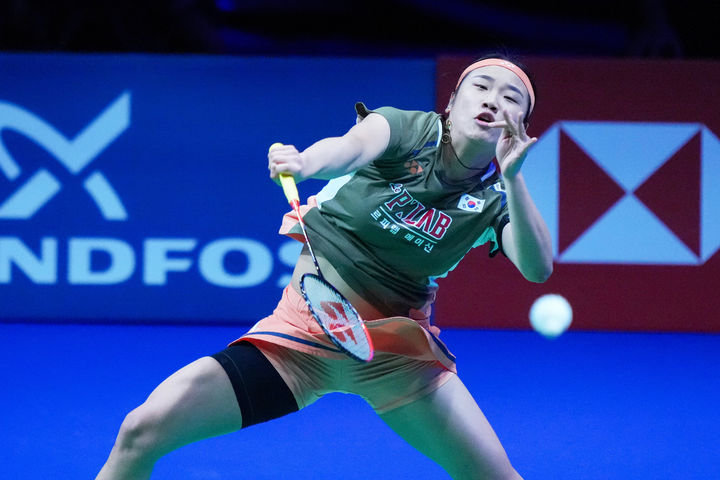 [오덴세=AP/뉴시스] 안세영(1위)이 18일(현지 시간) 덴마크 오덴세 유스케방크아레나에서 열린 2025 세계배드민턴연맹(BWF) 월드 투어 슈퍼750 덴마크오픈 여자 단식 4강전에서 야마구치 아카네(3위·일본)와 경기하고 있다. 지난 코리아오픈에서 야마구치에 패해 준우승에 그쳤던 안세영이 2-1(16-21 21-10 21-9) 역전승을 거두고 결승에 올라 시즌 8번째 우승에 도전한다. 2025.10.18. |