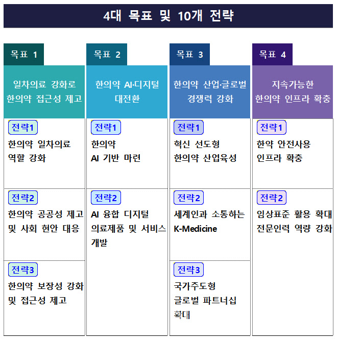 이 밖에도 한의약 산업구조 혁신으로 한의약 산업·시장 성장을 견인하고 K-Medicine 브랜드 경쟁력 강화를 통해 한의약 해외 진출을 확대한다. 더불어 지속 가능한 한의약 성장을 위해 한약 안전사용 인프라를 확충하고, 전문인력 역량을 강화하는 등의 내실 강화도 함께 진행된다.