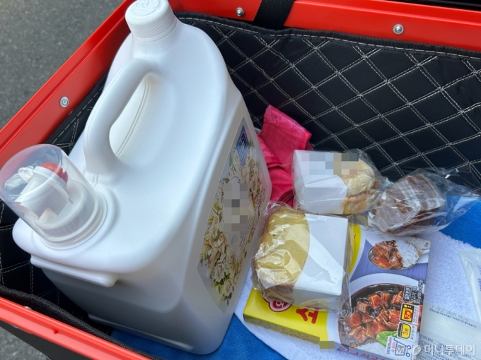 18일 오후 서울 강남구 푸드지원센터를 방문한 조모씨의 스쿠터 짐칸. 그는 "평소에 생활에 도움되는 것들을 가져간다"고 말했다./사진=김지현 기자. |