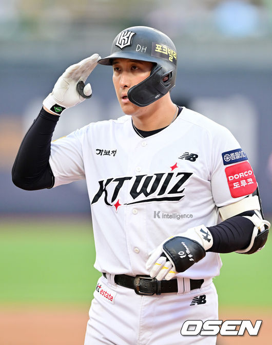 [OSEN=수원, 민경훈 기자] 3일 오후 수원 KT위즈파크에서 ‘2025 신한 SOL Bank KBO리그’ KT 위즈와 키움 히어로즈의 경기가 열렸다.홈팀 KT는 오원석, 원정팀 키움은 하영민을 선발로 내세웠다. 2회말 1사 주자 1,2루 KT 황재균이 중견수 왼쪽 1타점 적시타를 때린 후 1루에서 세리머니를 하고 있다. 2025.05.03 / rumi@osen.co.kr |