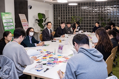 최호권 영등포구청장(왼쪽 가운데)이 올 3월 관내 YDP미래평생학습관에서 열린 ‘청년 원테이블 투어’에서 청년들과 이야기를 나누고 있다. 영등포구 제공 |