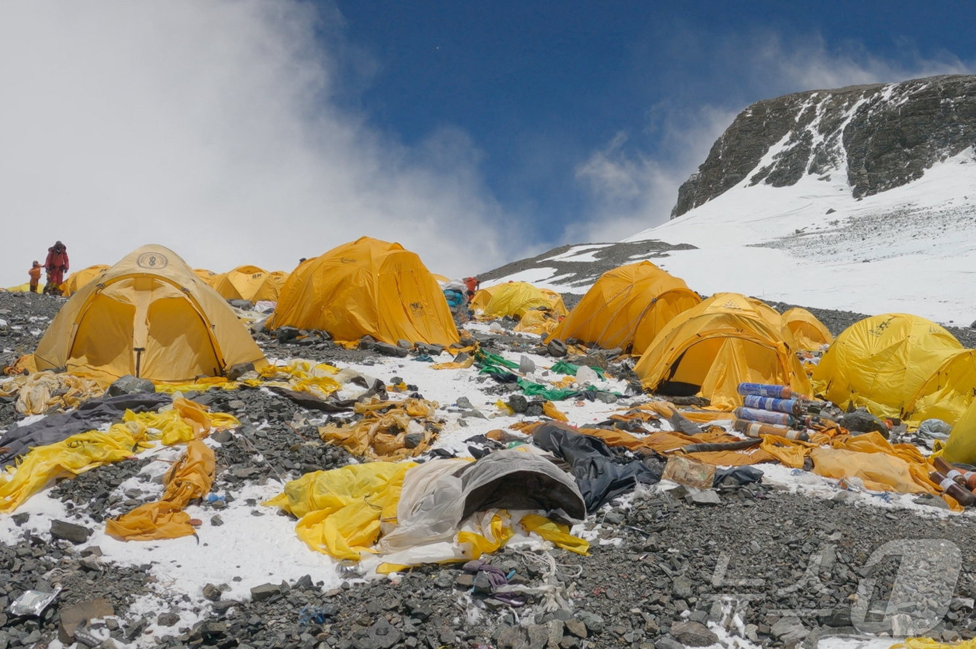 2023년 5월 19일(현지시간) 네팔 에베레스트산 해발 약 7920미터 지점에 위치한 캠프 4에 각종 텐트와 산악 장비, 식품 포장지 등 쓰레기가 흩어져 있다. (비단 슈레스타 제공) ⓒ 로이터=뉴스1 ⓒ News1 윤다정 기자 |