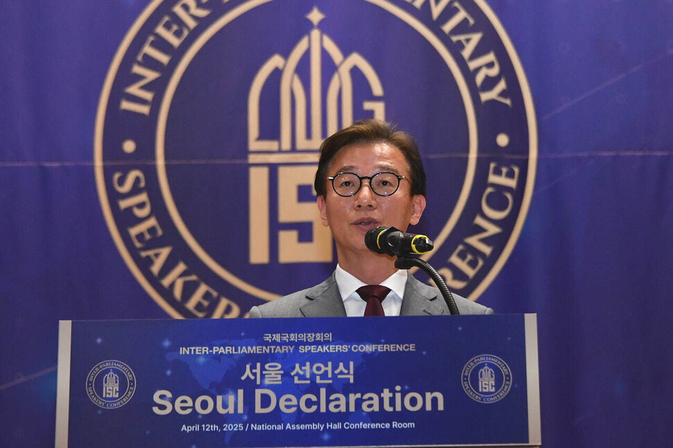 지난 4월12일 국제국회의장회의(ISC) 2025 서울선언문 발표에서 환영사하는 전재수 의원. 국제국회의장회의(ISC) 제공 |