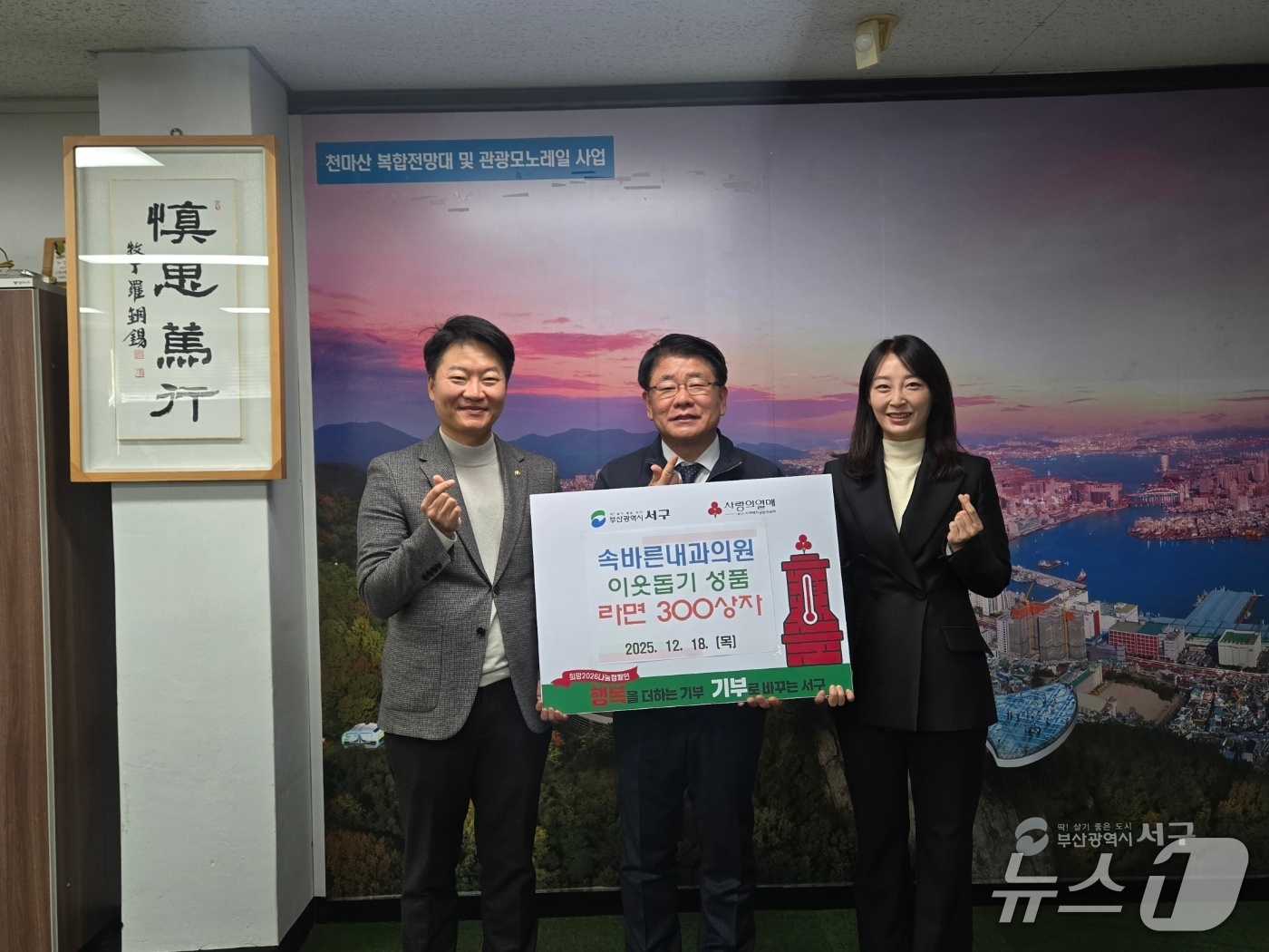 부산 속바른내과, 서구에 라면 300상자 기탁.왼쪽부터 김준모 속바른내과 대표원장, 공한수 서구청장, 정연정 속바른 인베스트먼트 대표.(속바른내과 제공. 재판매 및 DB금지) |