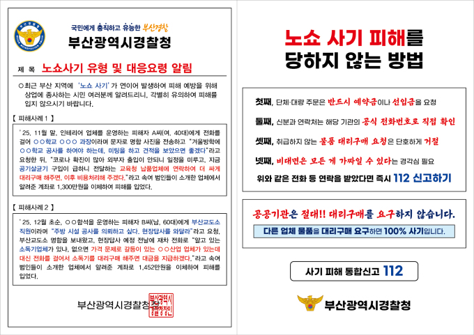 부산경찰청 관계자는 "공공기관이 대리구매를 요청하는 일은 없다"며 "다른 업체 물품을 대신 구매해달라는 요구는 100% 사기임을 명심해야 한다"고 당부했다.