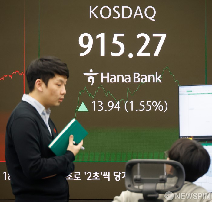 [서울=뉴스핌] 류기찬 기자 = 19일 오후 서울 중구 하나은행 딜링룸 전광판에 코스닥 지수가 표시되고 있다. 이날 코스피 지수는 전 거래일 대비 26.04포인트(0.65%) 오른 4020.55에, 달러/원 환율은 2.0원 내린 1476.30원에, 코스닥 지수는 13.94포인트(1.55%) 오른 915.27에 장을 마감했다. 2025.12.19 ryuchan0925@newspim.com |