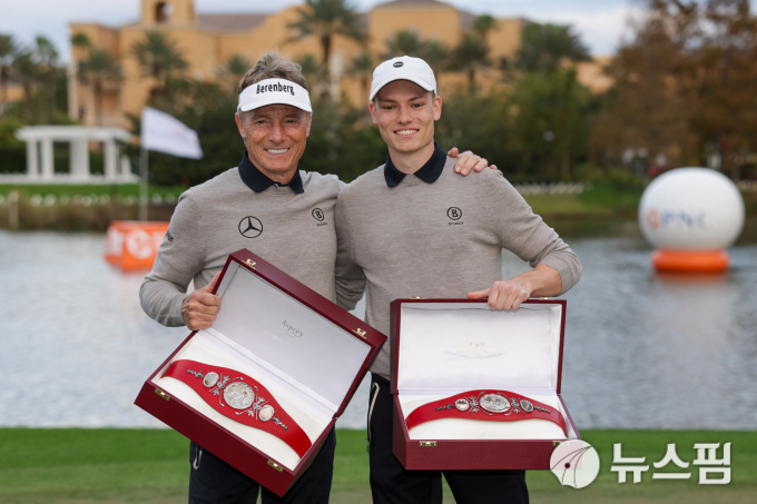 [올랜도 로이터=뉴스핌] 장환수 스포츠전문기자= 2024 PNC챔피언십에서 타이틀 방어에 성공하며 6번째 우승을 차지한 베른하르트 랑거 부자. 2024.12.23 zangpabo@newspim.com |