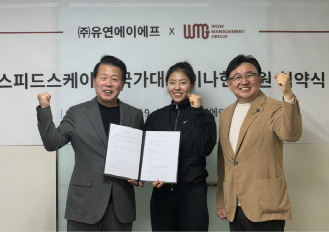 왼쪽부터 안교재 (주)유연에이에프 대표, 스피드스케이팅 선수 이나현, 장상진 와우매니지먼트 대표. 사진=와우매니지먼트 |