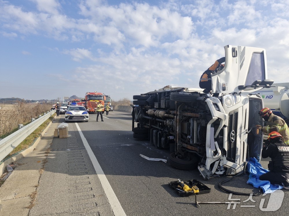 이 사고로 전도된 2.5톤 화물차 운전자 A 씨(50대)가 다쳐 인근 병원으로 옮겨졌다.