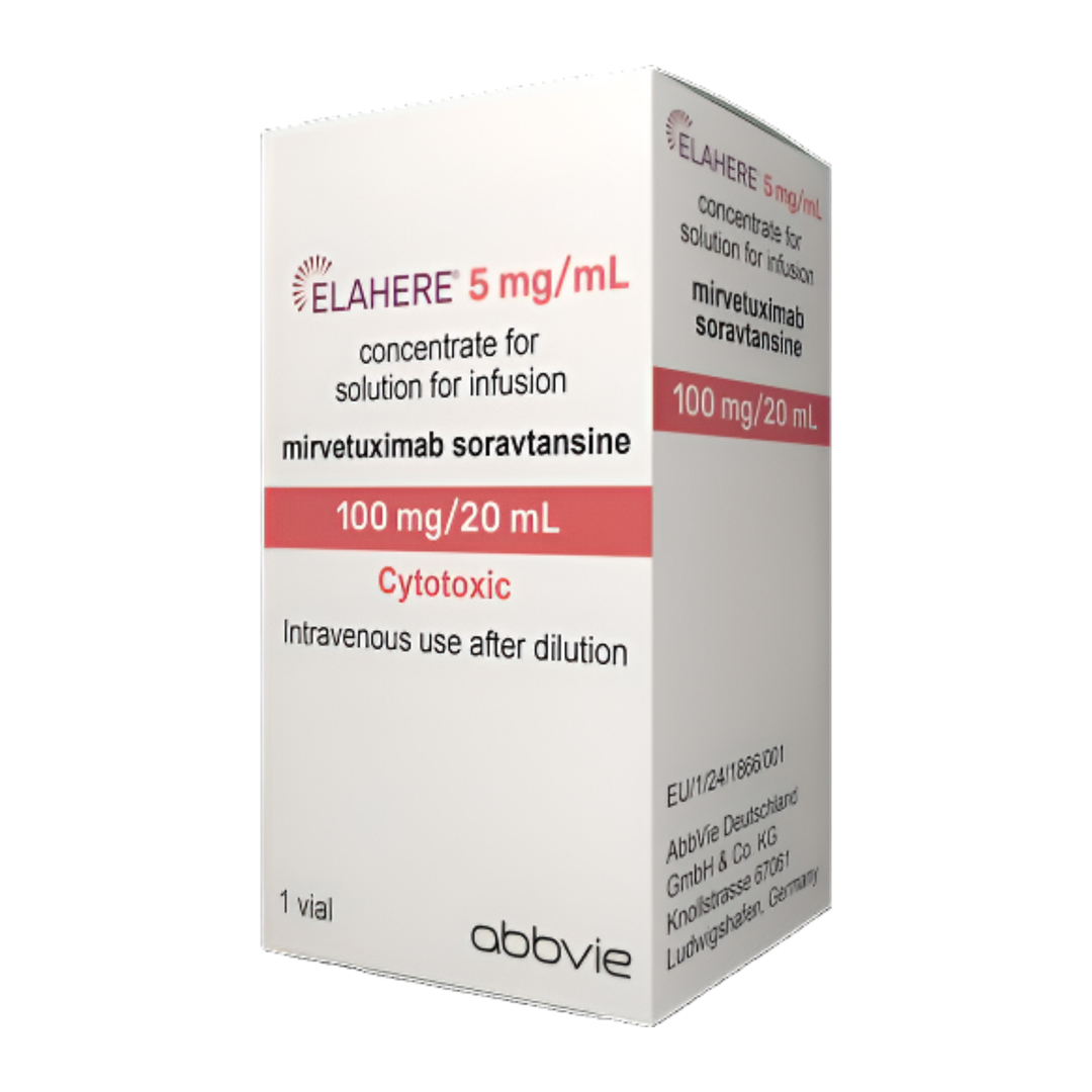 이번 허가는 이전에 한 가지에서 세 가지의 전신 요법을 받은 적이 있고, 엽산 수용체 알파(FRα) 양성이면서 백금기반 화학요법에 저항성이 있는 고등급 장액성 상피성 난소암, 난관암 또는 원발성 복막암 성인 환자에 대한 엘라히어 단독요법이다.