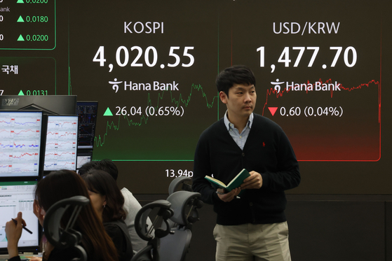 코스피가 기관의 매수세에 힘입어 상승 마감한 19일 서울 중구 하나은행 딜링룸 현황판에 전일 대비 0.65%상승한 4,020.55를 나타내고 있다. 원화값은 전날보다 달러당 2원 오른(환율 하락) 1476.3원을 기록했다.뉴스1 |
