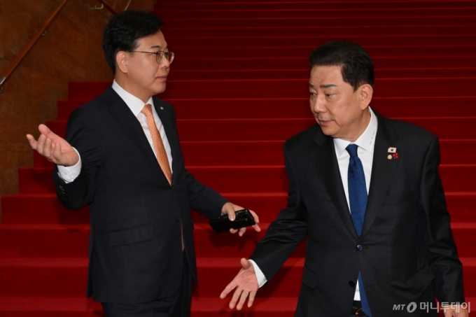 [서울=뉴시스] 김금보 기자= 김병기 더불어민주당 원내대표와 송언석 국민의힘 원내대표가 9일 서울 여의도 국회에서 우원식 국회의장 주재 원내대표 회동을 마치고 대화를 하고 있다.(공동취재) 2025.12.09. photo@newsis.com /사진= |