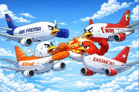 (왼쪽 위에서 시곗바늘 방향으로) 에어프레미아, 티웨이항공, 이스타항공, 제주항공 여객기. /이미지=챗GPT |