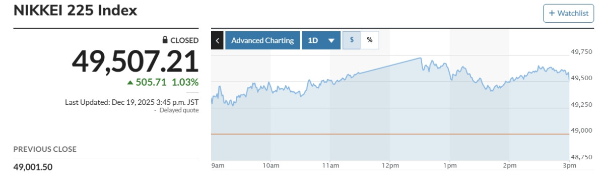 이날 마켓워치에 따르면 일본증시 대표 지수인 닛케이225 평균주가(닛케이)는 전 거래일 대비 505.71엔(1.03%) 오른 4만9507.21엔으로 마감했다. 상승 출발한 토픽스는 마감까지 추세를 이어갔다. 종가는 전날보다 26.77포인트(0.80%) 오른 3383.66으로 거래를 마쳤다.