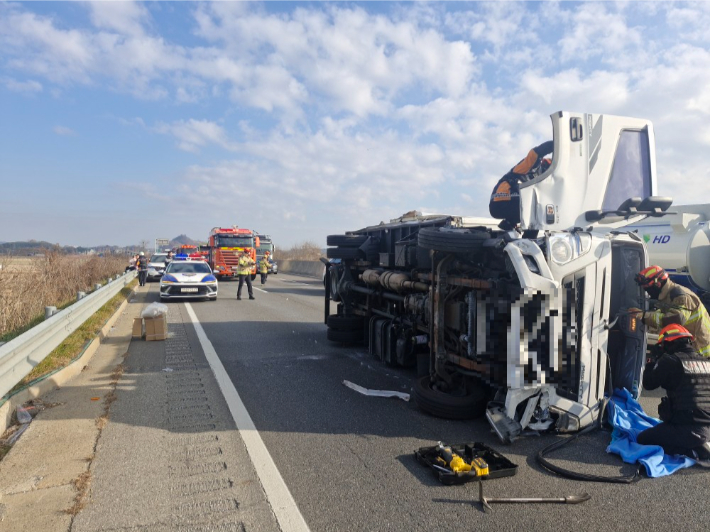이 사고로 2.5톤(t)화물차가 전도돼 늑골 등을 다친 운전자 A(50)씨가 병원에 옮겨졌고 다른 차에 타고 있던 3명도 가벼운 부상을 입어 병원 치료를 받았다.