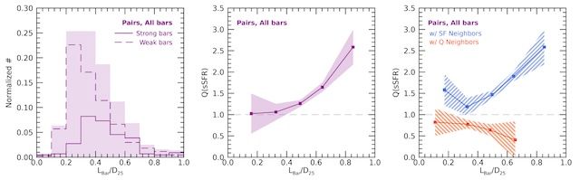 이웃 은하의 별 형성이 활발하고 가스가 많으면 중심 은하의 막대가 길고 강할수록 별 형성률이 증가한다는 것이다. 막대 구조가 풍부한 외부 가스를 중심으로 끌어와 별 생성을 증폭하기 때문이다.
