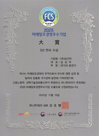모던텍의 핵심 경쟁력은 전력 분산 및 전력 가변 기술이다. 해당 기술은 기존 충전기 대비 대기전력을 약 70% 절감하고, 설치 비용을 80% 이상 낮출 수 있는 고효율 기술로 평가받고 있다. 이 기술은 현재 모던텍의 전 제품군에 적용되고 있으며, 한국에너지기술평가원(KETEP)이 실시한 기후가치평가에서 충전기 업체 최초로 'S등급'을 획득하는 데 기여했다. 또한 이러한 기술력을 인정받아 한국산업기술진흥원이 주관하는 '녹색인증'을 취득했다. 녹색인증은 탄소중립기본법에 근거해 친환경 유망 기술에 부여되는 제도로, 기후변화 대응과 미세먼지 저감 기술의 시장 확산과 기업 경쟁력 강화에 긍정적인 효과가 기대된다.