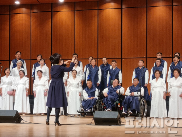 ▲ 완주장애인합창단 ‘꽃’이 무대에 올라 지휘자의 손짓에 맞춰 합창을 선보이고 있다. 완주문화재단은 이 합창단을 중심으로 한 지역·기업 협력 모델로 ‘2025 지역중심예술과 기업 동반성장 지원사업’ 우수사례에 선정됐다. ⓒ완주문화재단 |