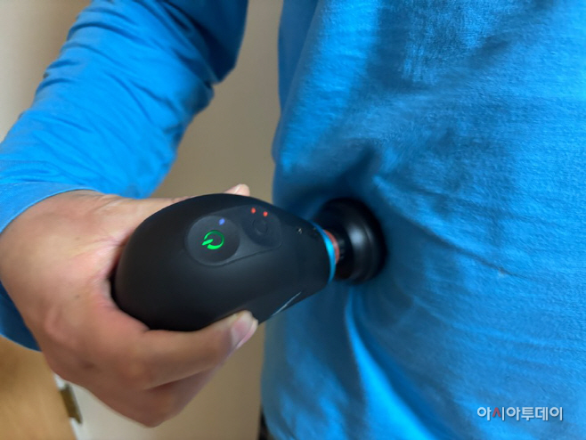 테라바디의 신제품 '테라건 미니 플러스'를 어깨와 등 부분에 사용하고 있는 모습./박진숙 기자 act@asiatoday.co.kr |