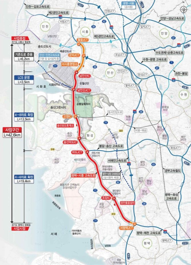 이번 확장 사업은 2013년 개통 이후 상습적인 차량 정체를 겪는 기존 평택-시흥 고속도로를 대상으로 진행된다. 신규 노선 건설이 아닌 기존 운영 노선을 활용하는 방식으로, 신규 토지 보상과 환경 부담을 최소화하면서도 교통 효율을 높일 수 있는 고효율 인프라 개선 모델로 평가받는다. 현재 왕복 4차로로 운영 중인 평택-시흥 고속도로는 이번 사업을 통해 6~8차로로 확장된다. 서평택나들목(JCT)에서 마도 JCT까지는 6차로로, 마도 JCT에서 남안산 JCT까지는 8차로로 각각 확장되며 총 공사 기간은 60개월이 소요될 예정이다.