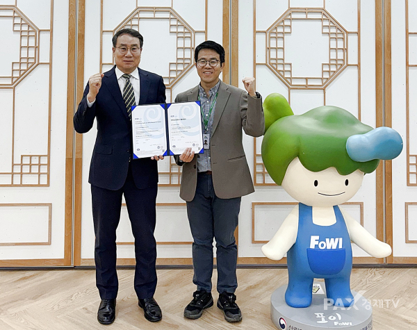 황성태 부원장(왼쪽)이 '안전보건경영시스템(ISO 45001)' 국제인증 취득 후 기념 촬영을 하고 있다. [사진제공=한국산림복지진흥원][대전=팍스경제TV] 한국산림복지진흥원(이하 산림복지진흥원)은 오늘(19일) 국제표준화기구(ISO)로부터 산업안전보건 분야의 최고 수준인 '안전보건경영시스템(ISO 45001)' 국제인증을 취득했다고 밝혔습니다.