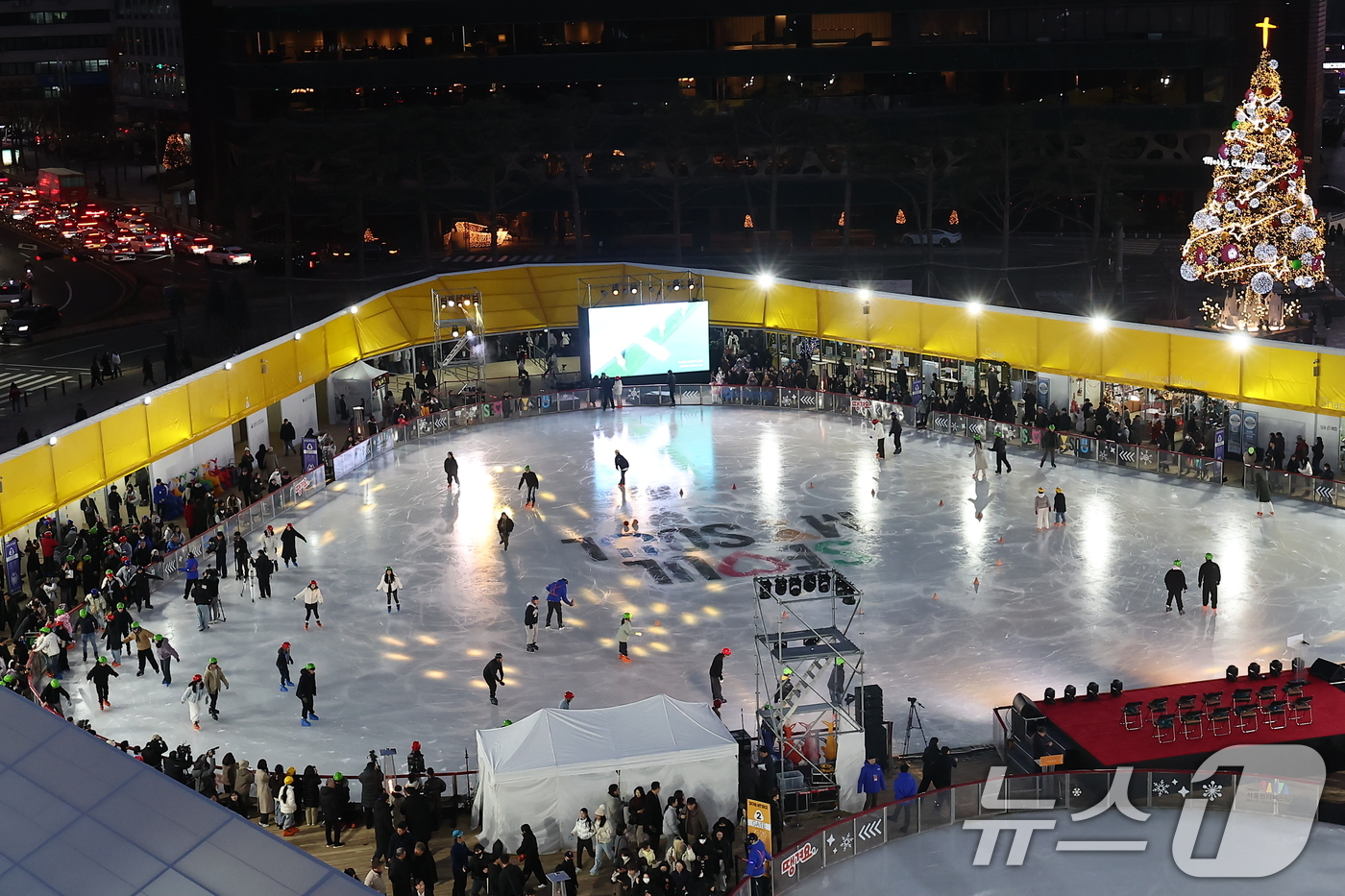 (서울=뉴스1) 김도우 기자 = 19일 오후 서울광장 스케이트장에서 시민들이 스케이트를 타며 즐거운 시간을 보내고 있다. 이날 개장한 서울광장 스케이트장은 내년 2월 8일까지 52일 동안 운영한다. 2025.12.19/뉴스1