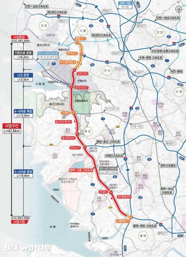평택~시흥 고속도로는 2013년 개통 이후 상습적인 교통 정체를 겪고 있다. 이번 확장 사업을 통해 현재 왕복 4차로로 운영 중인 도로를 6~8차로로 확장할 계획이다. 서평택 분기점(JCT)에서 마도 JCT까지는 6차로로, 마도 JCT에서 남안산 JCT까지는 8차로로 확장되며 총 공사 기간은 60개월이 소요될 예정이다.